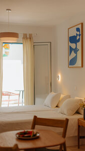 Alle Studios verfügen über einen eigenen Balkon oder eine Terrasse sowie eine kleine Küche oder einen Kühlschrank mit Geschirr und Kaffeemaschine. Während die Erdgeschoss Studios viel Privatsphäre bieten, genießen Gäste in den oberen Etagen einen schönen Blick auf die landestypische Umgebung. Self-Check-in und -Check-out sowie tägliche Reinigung ermöglichen einen flexiblen Aufenthalt, während lokale Empfehlungen der Gastgeberinnen den Gästen helfen, die Insel eigenständig zu entdecken.